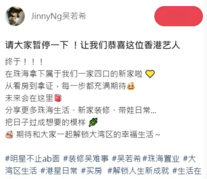 吴若希照旧不是第一次买房了,可是第一次在内地买房,而且因为买的是净水房,她可以躬行参与屋子的贪图与装修,是以才颠倒振作。吴若希自曝会在珠海买房的原因,主要原因天然是为她要在内地大湾区发展,在内地置业了之后就不需要住货仓,或是频繁来去香港内地。更具体的原因,还有交通便利,她称从香港的家开赴到珠海新房,流程港珠澳大桥,全程只需要一个半小时,还包括通关,豪门国际官网娱乐平台卓著快捷。其次也因为珠海的合座归天水平比拟低,更符合清平天下——她莫得公开在珠海买房的破耗,但称购入屋子的性价比很高,当地的楼价比香港低许多,当年一家四口没准会搬到珠海糊口。